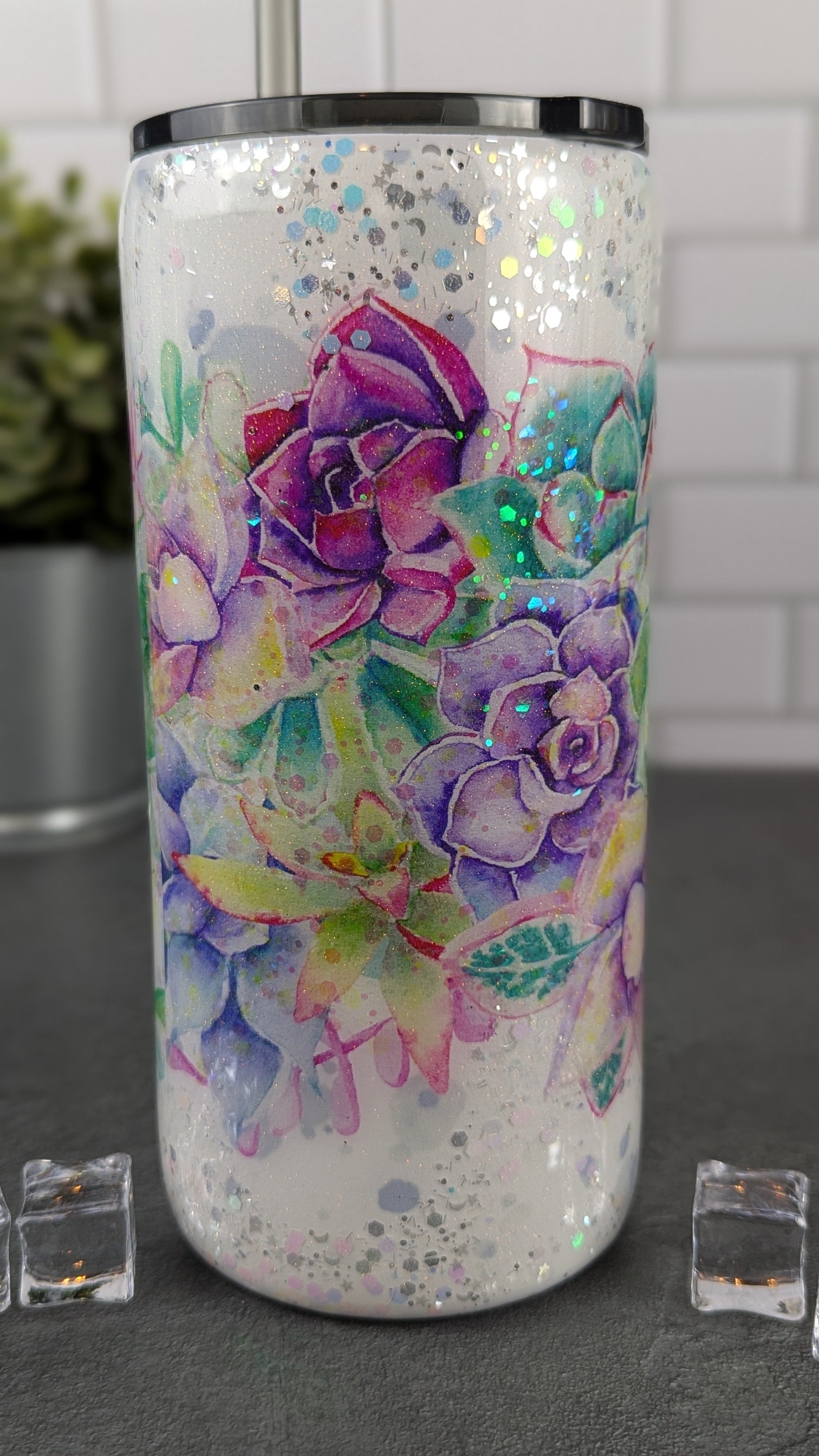 Add a touch of nature to your everyday routine with our 22 oz tumbler adorned with sparkling glitter and beautiful succulent plants. Keep your drinks hot or cold for hours while showing off your unique style. Perfect for work, school, or on-the-go adventures.